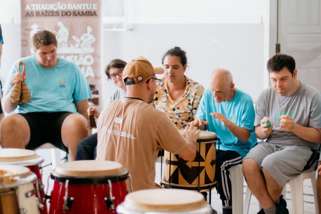 Candemil, que há anos se dedica a ações formativas ligadas à cultura percussiva, propôs uma experiência adaptada, acolhedora e orientada ao potencial expressivo de cada participante. A oficina apresentou elementos da tradição bantu, matriz fundamental para a formação das raízes do samba no Brasil, aproximando os estudantes de ritmos que dialogam com diferentes níveis de percepção sonora, corporal e rítmica.