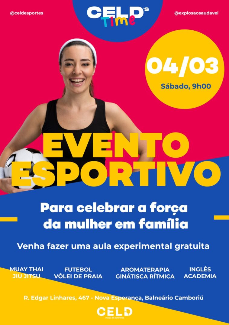 Neste sábado, dia 4/3, a CELD Esportes fará um evento esportivo gratuito para celebrar o Dia Internacional da Mulher. A partir das 9 horas da manhã, terão diversas atividades para as mulheres e famílias como: aulas de ginástica rítmica, futebol, vôlei de praia, Jiu Jitsu, Muay Thai, academia, aulas de inglês, além de sessões de massagem com aromaterapia, coquetéis e sorteios imperdíveis. “Queremos homenagear as mulheres pelo seu dia e também as famílias. Nossa proposta é tornar a vida das famílias mais práticas, saudáveis e repleta de alegria, renovando as memórias afetivas e agregando momentos de qualidade em família”, explica Aline Cristina Dalmolin.