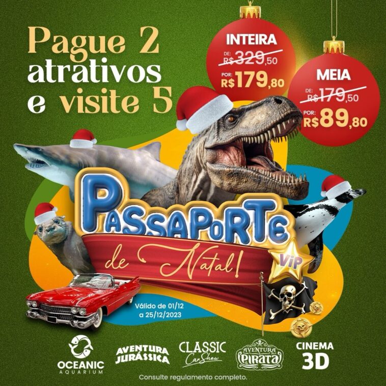 O visitante compra entrada para o aquário e o parque dos dinossauros e ganha os ingressos para as outras. O valor da entrada inteira fica de R$329,50 por R$179,80. Já a meia-entrada fica em R$89,80! É para curtir as férias ao máximo faça chuva ou faça sol! A promoção Passaporte de Natal é válida para compra e utilização até o dia 25/12/2023, pode adquirir nas bilheterias, site ou pontos oficiais.