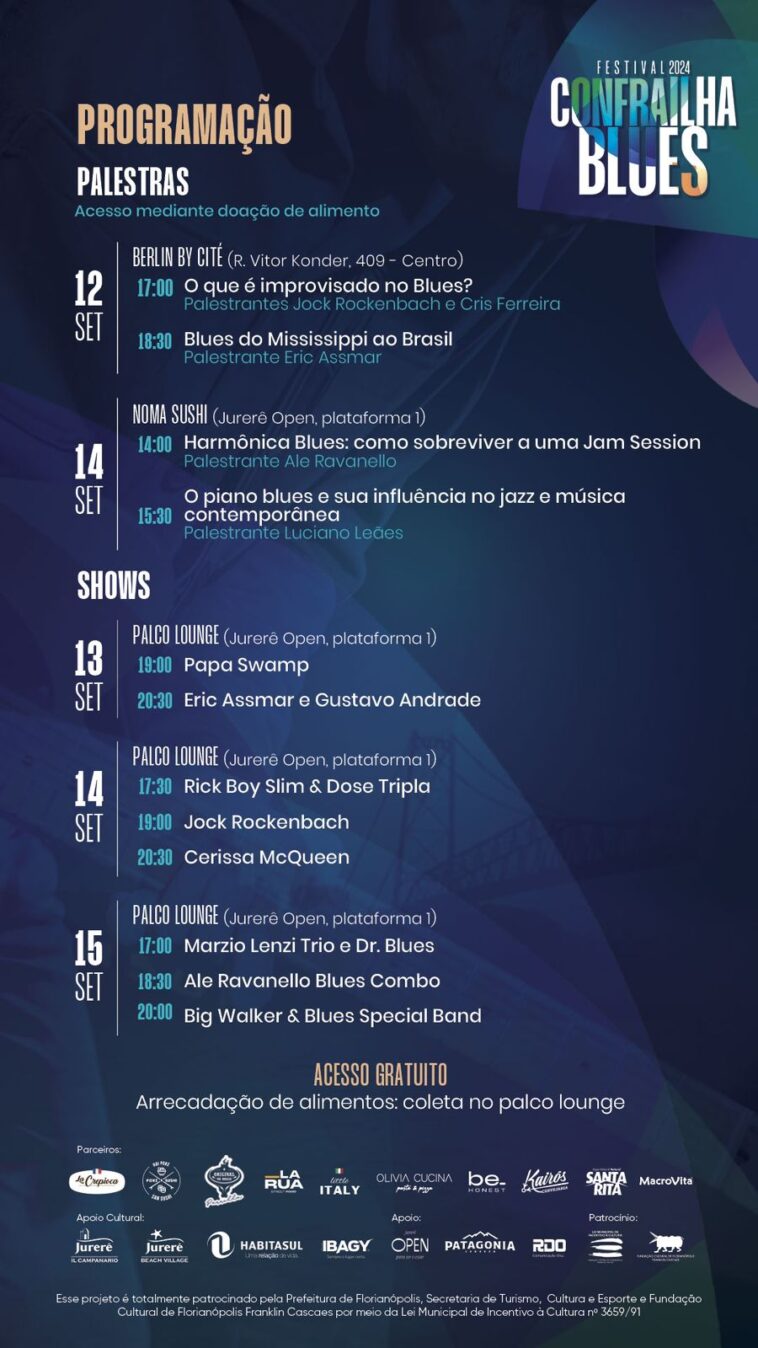 Salve pessoal! Festival Confrailha Blues 2024 inicia nesta quinta com as palestras no Berlin by Cité e se estende até domingo com programação no Jurerê Open. Acesso é gratuito, mas não se esqueça de contribuir na nossa campanha de arrecadação de alimentos, pontos de coleta nas palestras e no palco lounge. Nos vemos por lá!