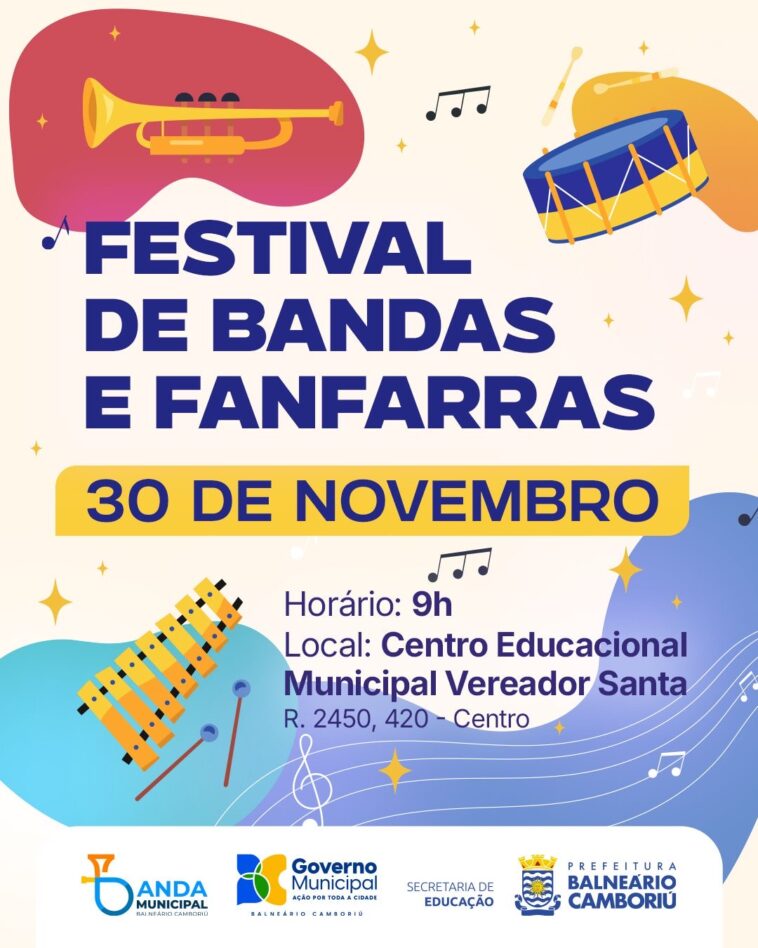 Domingo (30) será um dia musical em Balneário Camboriú: o Centro Educacional Municipal (CEM) Vereador Santa, no Centro, será palco do Festival de Bandas e Fanfarras da Rede Municipal de Educação. No total, 14 bandas e fanfarras se apresentarão das 9h às 12h, celebrando o encerramento de 2025.