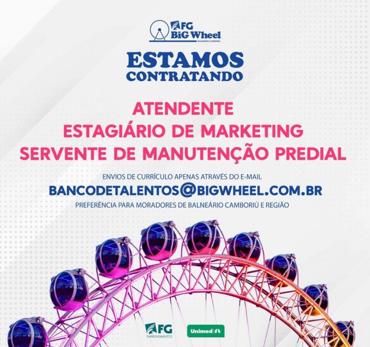 A FG Big Wheel está reforçando a equipe com a chegada da temporada de verão. Foram abertas mais oito vagas para início até 15 de dezembro. Seis vagas são para atendimento ao público. Os interessados devem ser comunicativos, proativos e preferencialmente morar em Balneário Camboriú ou região. As outras duas oportunidades de emprego são para servente de manutenção predial e estagiário de marketing. Os currículos devem ser enviados para o e-mail bancodetalentos@bigwheel.com.br.