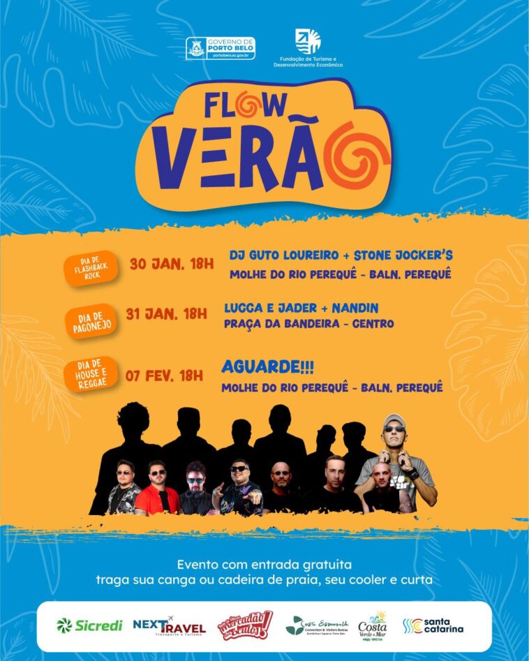 No dia 30 de janeiro (sexta-feira), o evento será realizado no Molhe do Rio Perequê, e promete um final de tarde de flashback e rock. Já no dia 31 de janeiro (sábado), o Flow Verão ocupa a Praça da Bandeira, no Centro, e os ritmos da tarde são o sertanejo e o pagode. Encerrando a programação, no dia 7 de fevereiro (sábado), a música retorna ao Molhe do Rio Perequê, com duas atrações surpresas mas que prometem muita diversão.