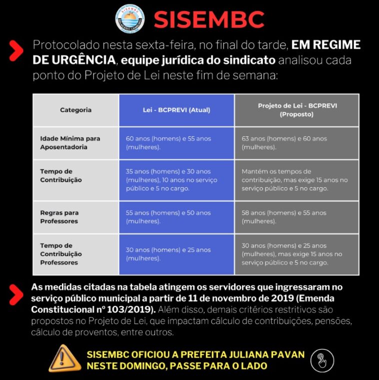 Neste segunda-feira (10/02), o SISEMBC já tomou medidas e OFICIOU a prefeita Juliana Pavan solicitando a RETIRADA imediata do Projeto de Lei da votação desta terça-feira (11/02), na Câmara de Vereadores.