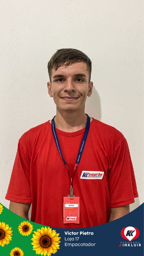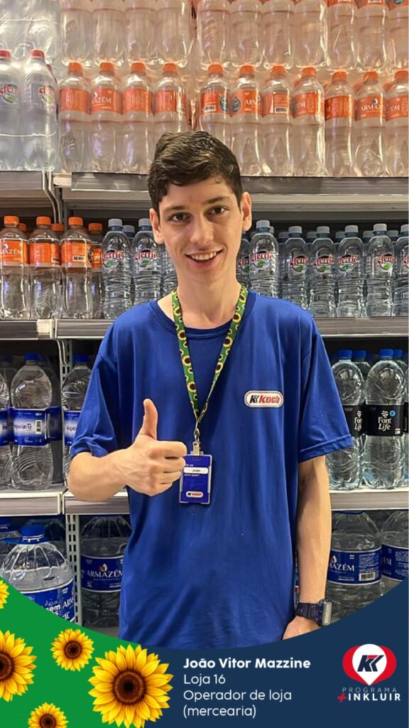 Graças às ações do programa +INKLUIR, o João Vitor Mazzine Oliveira, que é autista passou de empacotador e para operador de loja, auxiliando nas operações gerais da loja, desde atendimento aos clientes à reposição de mercadorias. Ele está há cinco anos na empresa. “O grupo Koch me acolheu muito bem e gosto muito de trabalhar aqui. Eu tive a oportunidade de subir de cargo. Todos os dias aprendo coisas novas”, conta.
