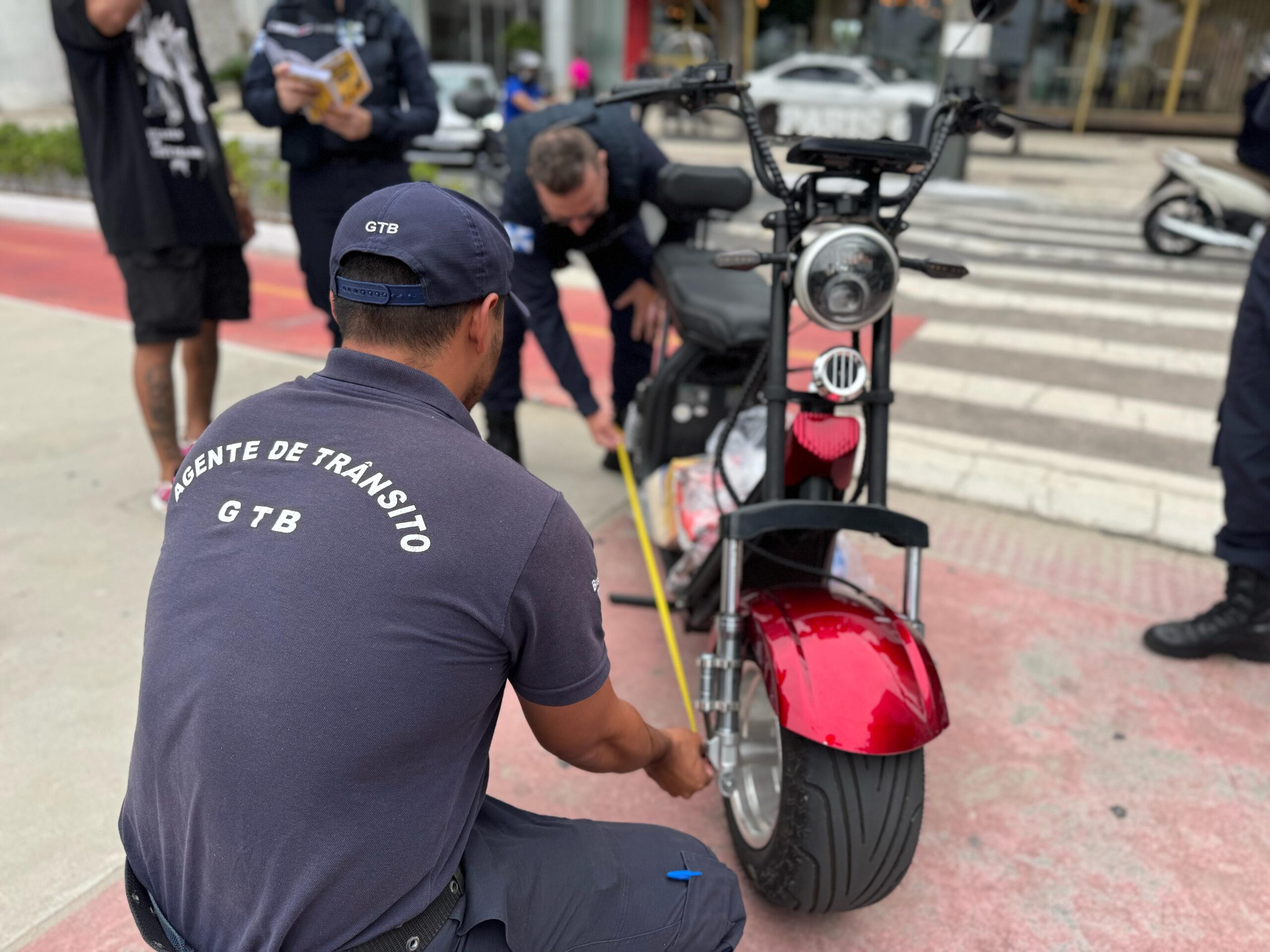 Na tarde desta quinta-feira (24), cinco guardas de trânsito de Brusque (SC) estiveram com os Agentes de Trânsito de Balneário Camboriú, adquirindo conhecimento prático sobre a fiscalização de autopropelidos e ciclomotores no município. Para isso, foi montada uma barreira de fiscalização na Praça Almirante Tamandaré, onde foram abordados 16 destes modais de transporte.