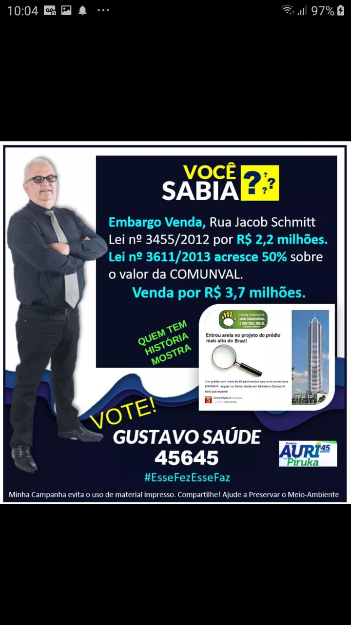 Em 2012, após aprovação de venda da Rua Jacob Schmidt entrei com DENÚNCIA no MP pelo FÓRUM DA TRANSPARÊNCIA E CONTROLE SOCIAL, junto com Anderson Beluzzo, Ivo Buzarello e Dimas Casarin.