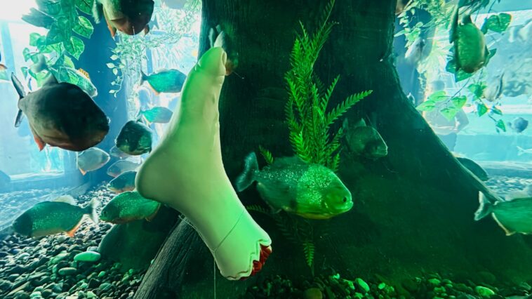 Os visitantes que passarem pelo Oceanic Aquarium até o próximo domingo (2) encontrarão um clima diferente no espaço. Ao longo do trajeto, além de tubarões, pinguins e peixes raros, será possível ver uma mão e um pé misteriosos flutuando entre as piranhas, um mini esqueleto com os cavalos-marinhos, caveiras e abóboras destinadas aos jacarés, lontras e capivaras, além de aranhas decorativas dividindo espaço com os axolotes – entre outros elementos em alusão ao Halloween.