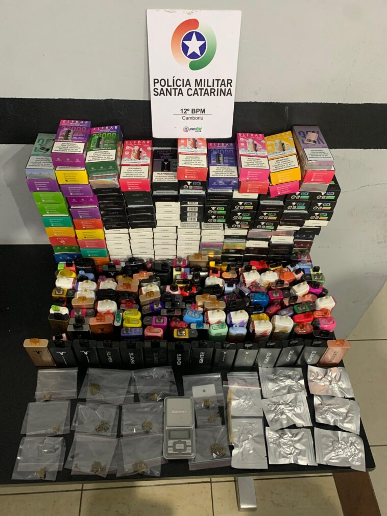 Já na sua residência, na Quarta Avenida, em Balneário Camboriú, foram encontrados maconha, haxixe e skunk fracionadas e prontas para venda, além de 154 unidades de cigarros eletrônicos.