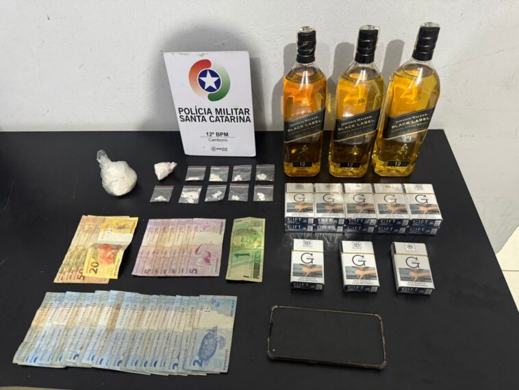 Também foram apreendidas: 13 carteiras de cigarros da marca GIFT, R$243,00 em dinheiro fracionado, 01 aparelho celular, 03 whisky que são de coloração distinta ao original, causando dúvidas sobre a autenticidade.