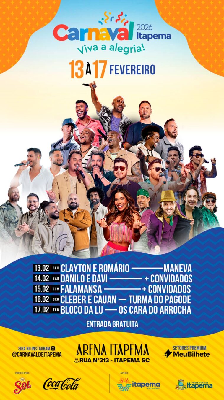 Itapema realiza entre os dias 13 e 17 de fevereiro um mega Carnaval com shows nacionais gratuitos, reunindo grandes atrações musicais em uma estrutura especialmente montada na orla da Meia Praia, na altura da Rua 307, anexo a Arena Viva Verão e do COI. A programação promete atrair moradores e turistas com noites de grandes shows e diferentes estilos musicais.