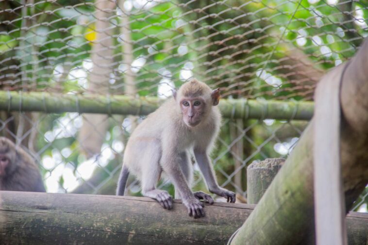 Atração do Zoo de Balneário Camboriú, o macaco-caranguejeiro rejeitado pela família está, feliz, em seu novo recinto.