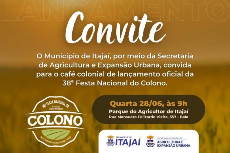 O Município de Itajaí, através da Secretaria de Agricultura e Expansão Urbana, realiza na manhã desta quarta-feira (28) o lançamento oficial da 38ª Festa Nacional do Colono. O café colonial acontece a partir das 9h no Parque do Agricultor, no bairro Baía, para imprensa e autoridades.