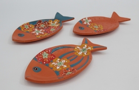 Kits petiscos “Rio dos Robalos”, composto por três travessas em cerâmica, a temática alusiva a uma das prováveis origens do nome “Camboriú”.