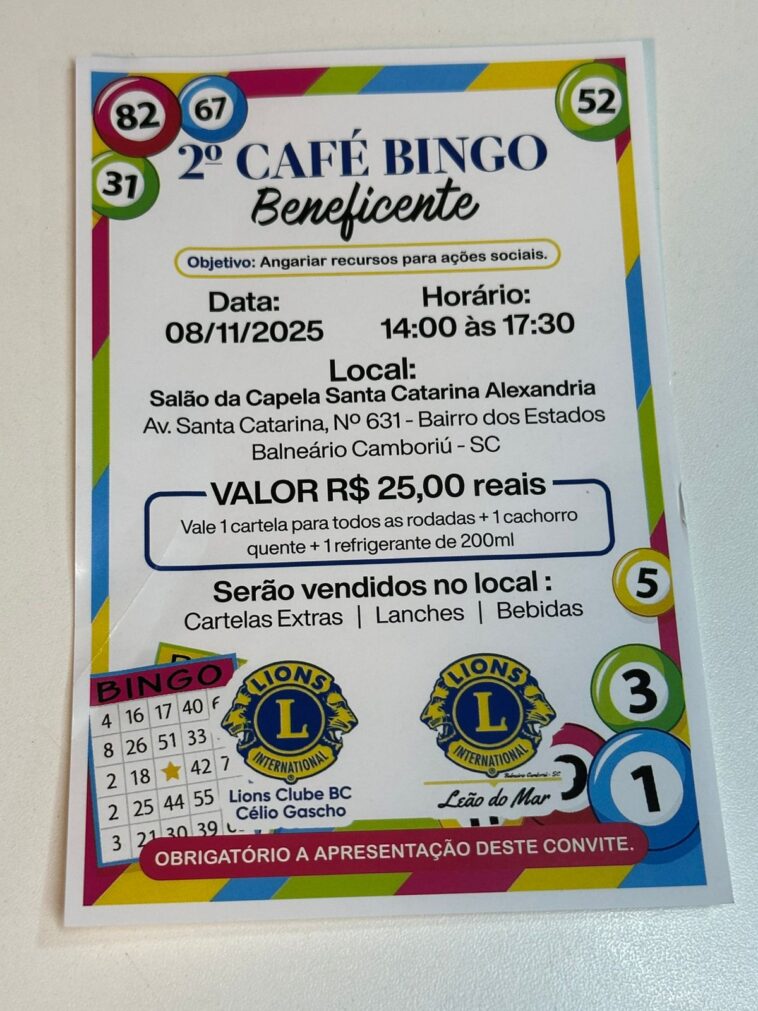 O Lions Clube BC Célio Gancho e Lions Clube Leão do Mar, promovem no próximo dia 8 de novembro o 2° Café Bingo Beneficente com o objetivo de angariar recursos para ações sociais. O Bingo vai ocorrer das 14 as 17:30 no Salão da Capela Santa Catarina Alexandria, no Bairro dos Estados. Serão vendidos no local: cartelas extras, lanches e bebidas. Valor da cartela R$ 25,00 ( vale 1 cartela para todas as rodadas + 1 cachorro quente + 1 refrigerante de 200ml)