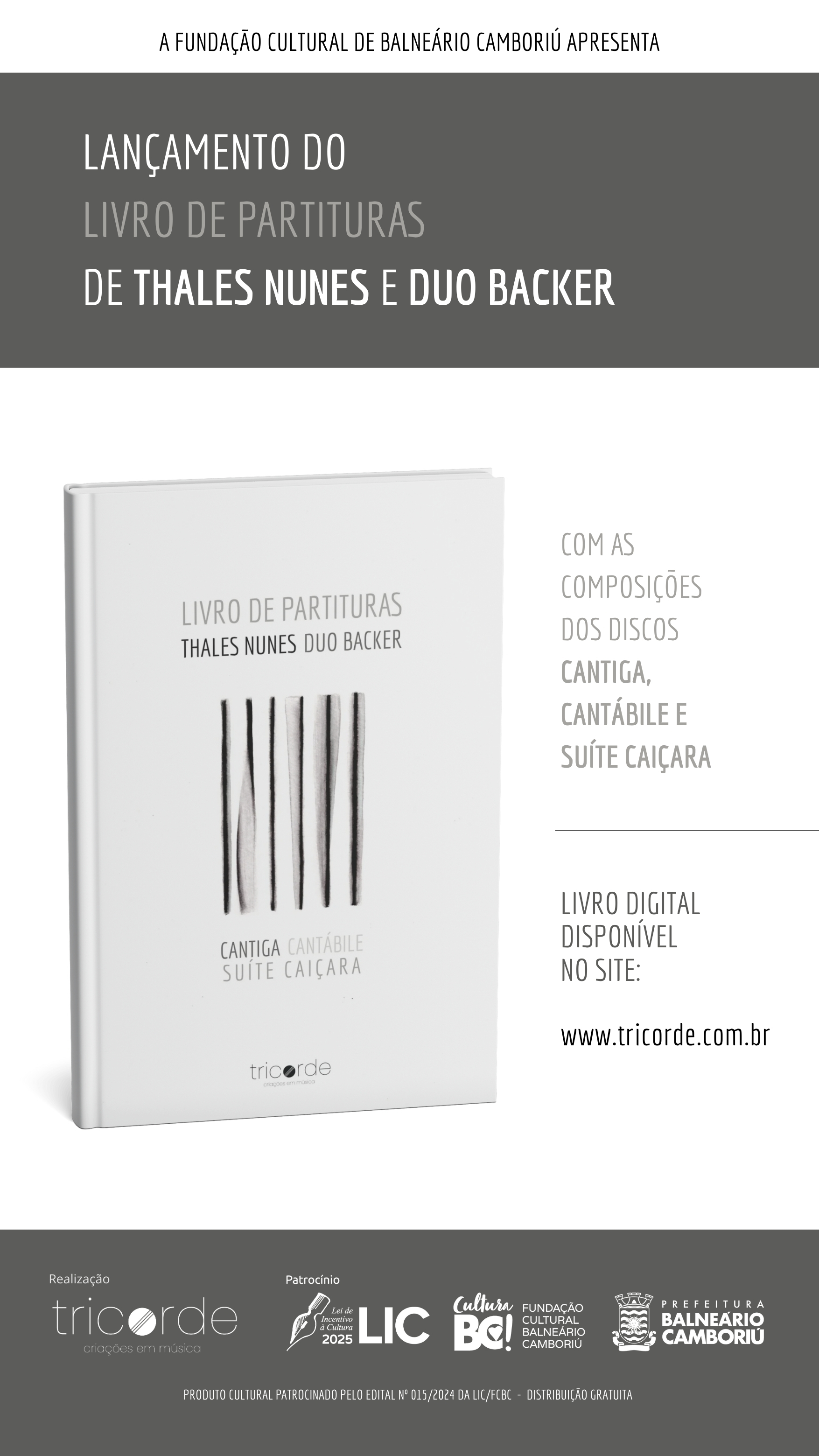 O projeto foi patrocinado pela Fundação Cultural de Balneário Camboriú, por meio da Lei de Incentivo à Cultura (LIC) 2025, conforme o Edital nº 015/2024 da LIC/FCBC.