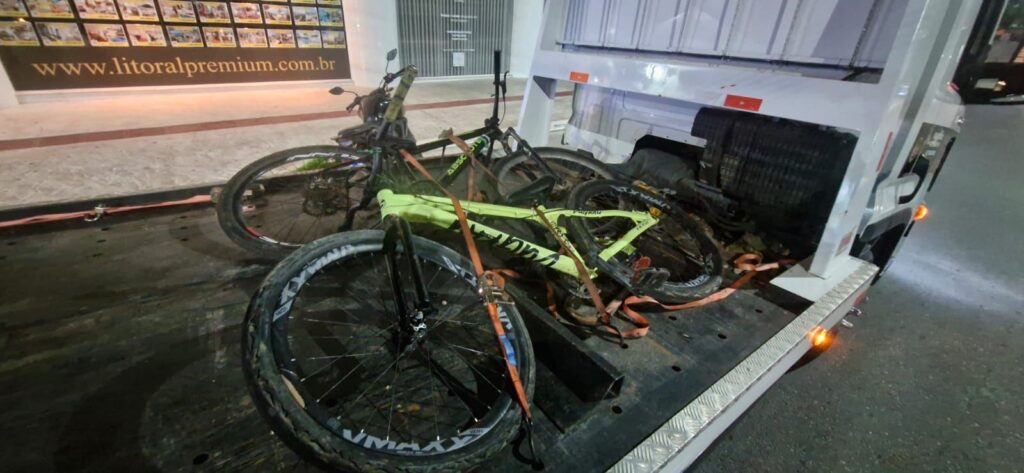 Na sequência, já na Rua João F. dos Santos, uma das bicicletas derrapou durante uma curva, momento em que o condutor abandonou o local correndo. A bicicleta foi localizada logo em seguida, com apoio de uma guarnição da Polícia Militar que passava pela região.