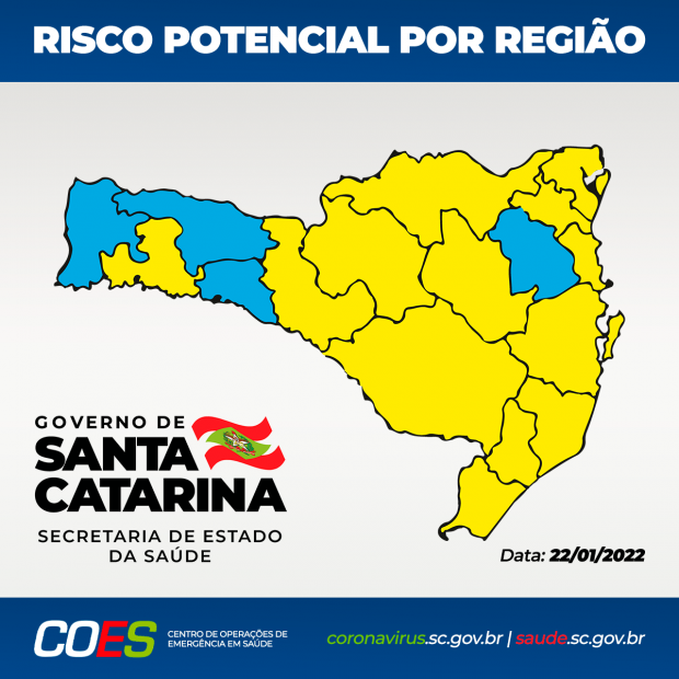 A Matriz de Risco Potencial Regionalizado divulgada neste sábado, 22, aponta 13 regiões classificadas como risco potencial alto (cor amarelo) e quatro no nível de risco moderado (cor azul). Em um comparativo com o relatório divulgado na semana anterior, as regiões do Extremo Oeste, Médio Vale do Itajaí e Xanxerê, que estavam classificadas no nível alto (amarelo), tiveram melhora nos indicadores e passaram a ser classificados no nível moderado (azul), juntando-se ao Alto Uruguai Catarinense. Já o Vale do Itapocú, que estava no nível moderado (azul), teve piora na dimensão transmissibilidade, se juntando às regiões do Alto Vale do Itajaí, Alto Vale do Rio do Peixe, Carbonífera, Extremo Sul Catarinense, Foz do Rio Itajaí, Grande Florianópolis, Laguna, Meio Oeste, Nordeste, Oeste, Planalto Norte e Serra Catarinense que se mantiveram no nível alto (amarelo).