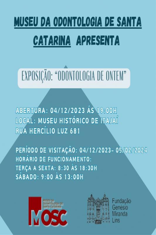 O Museu Histórico de Itajaí receberá a mostra “Odontologia de Ontem”, do Museu de Odontologia de Santa Catarina. A exposição itinerante abre na segunda-feira (04), às 19h, e oferece uma visão enriquecedora sobre a evolução da odontologia ao longo do tempo, destacando instrumentos e técnicas da profissão.