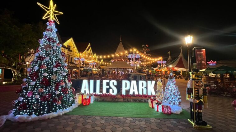 A decoração natalina do Alles Park, ainda tem bolas vermelhas gigantes nas árvores naturais, guirlandas, muitas luzes e um presépio que fascina os visitantes.