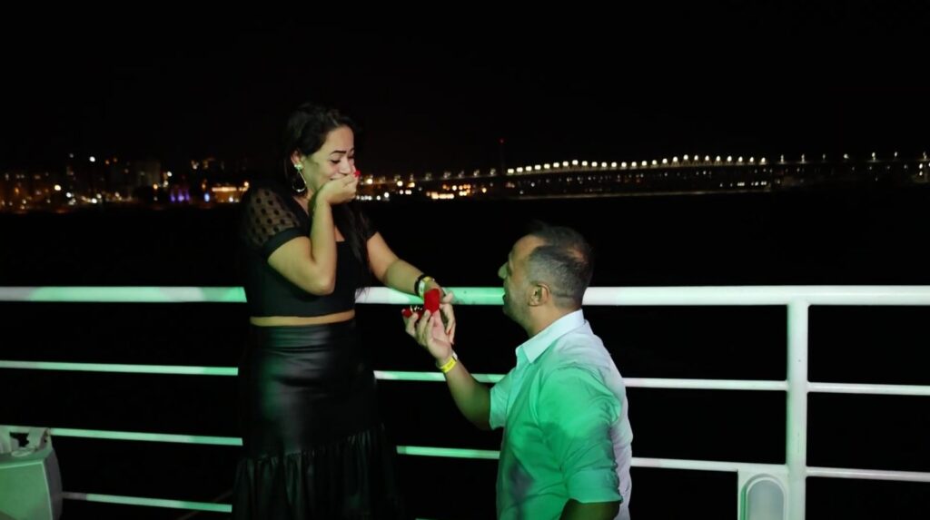 Fotos do casal de empresários também foram exibidas na tela. A bordo do Catamarã, com balões vermelhos, e ao som de violino, o clima à beira-mar ficou ainda mais romântico quando surgiu a surpresa maior. A Megatela Floripa Square brilhou o pedido “Casa Comigo?” surpreendendo ainda mais a noiva e a todos que faziam o passeio junto com o