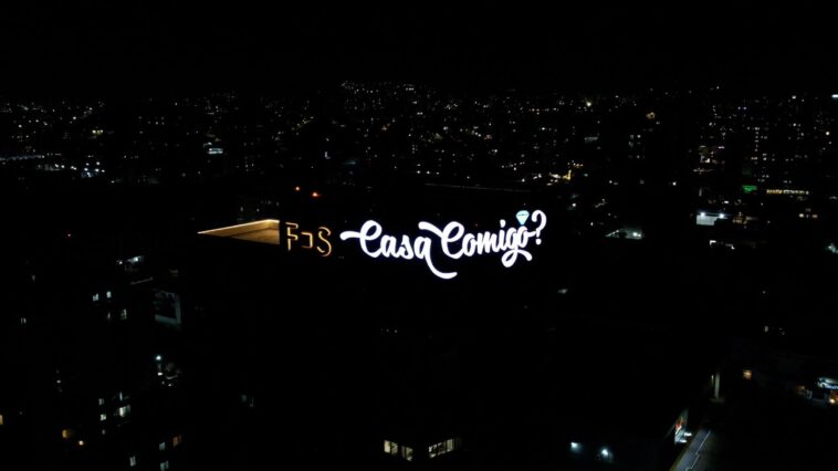 De uma maneira inesquecível e inédita no Brasil, uma paraense foi surpreendida com um pedido de casamento gigante, na noite de sábado, 27 de abril, em Florianópolis!!! Enquanto Suellen e Everson desfrutavam de um passeio de Catamarã pela baía norte, a maior tela de LED em Rooftop da América Latina, iluminou-se com uma declaração de amor que culminou no emocionante “Casa comigo?”.