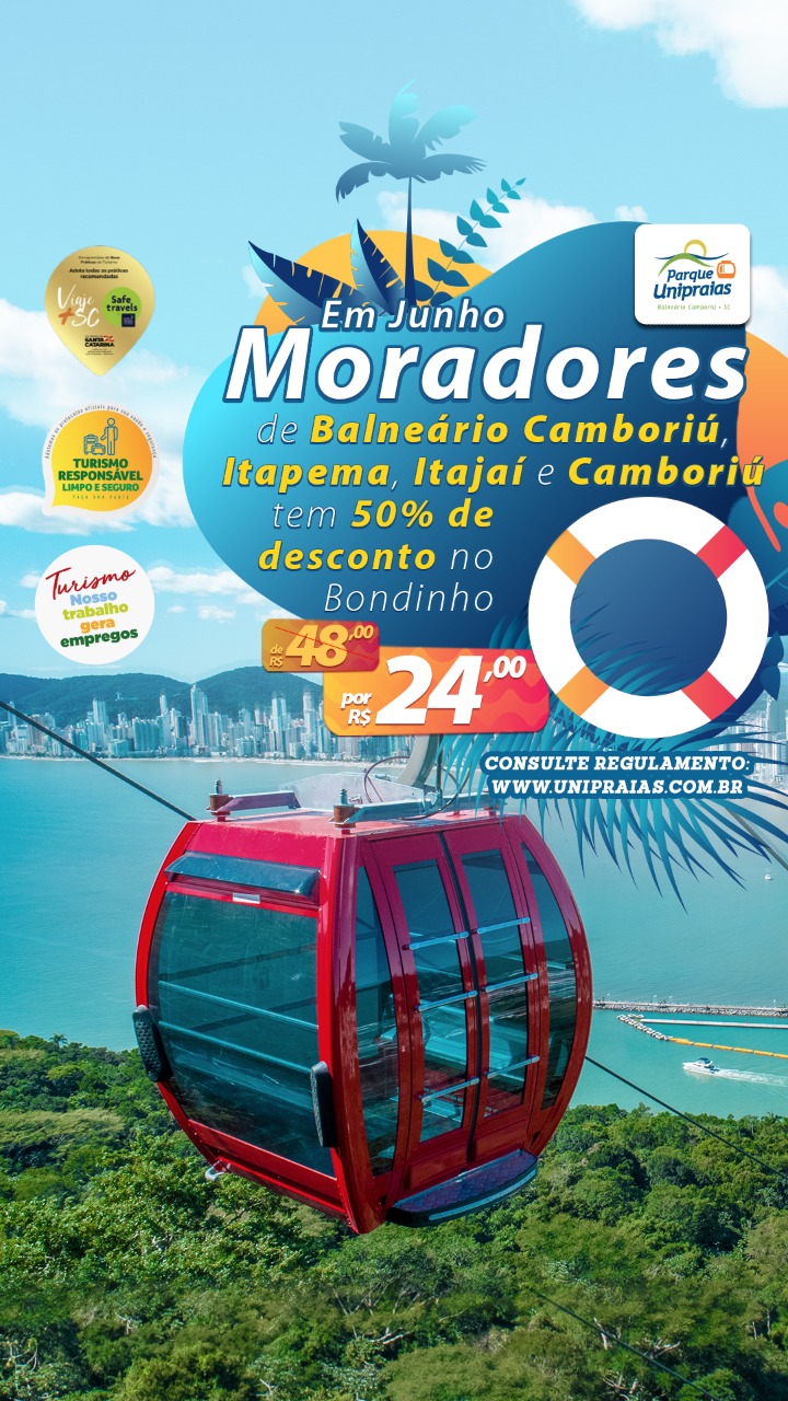 O Parque Unipraias lança a partir do dia 1º de junho uma promoção exclusiva para os moradores das cidades de Balneário Camboriú, Itapema, Itajaí e Camboriú, com 50% de desconto no valor do BondinhoLEIA MAIS