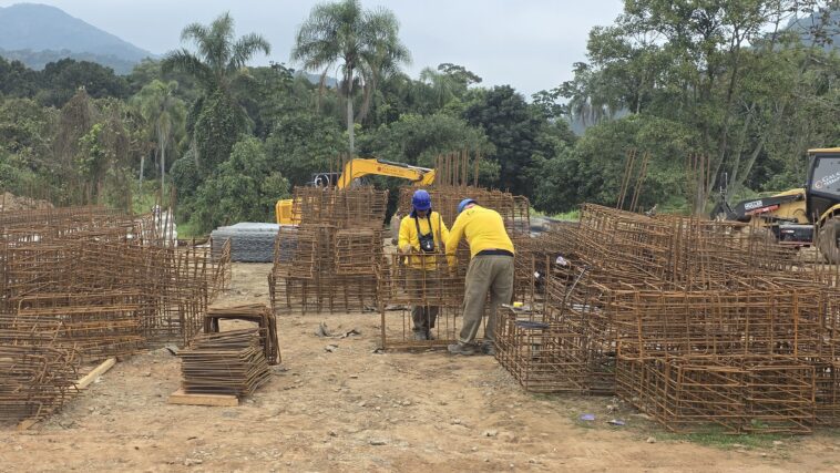 Nesta fase, as equipes atuam na execução da estrutura inferior, com montagem de colunas, pilastras e aplicação do concreto conforme o projeto executivo. O material metálico também está sendo moldado e instalado pelos operários.