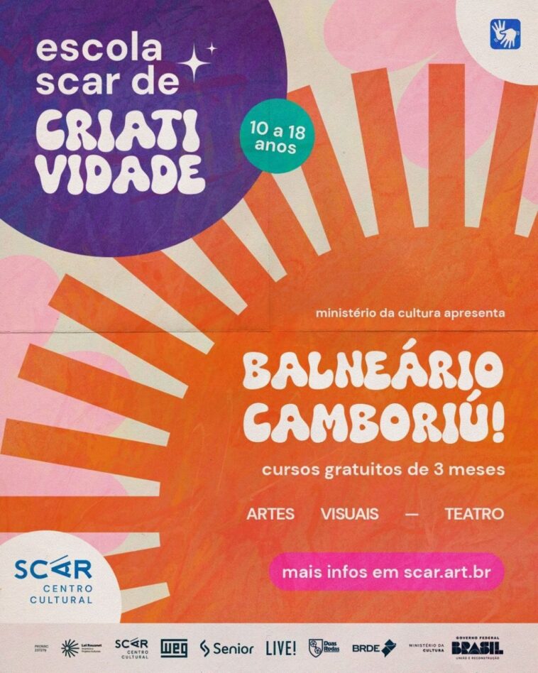 A Sociedade Cultura Artística (Scar) vai oferecer oficinas de teatro e artes visuais gratuitas para crianças e adolescentes de Balneário Camboriú. Direcionadas a estudantes de 10 a 18 anos matriculados no ensino fundamental ou médio e residentes em Balneário Camboriú, as atividades ocorrerão no Centro Comunitário João Gerônimo Vicente (Rua Dom Daniel, Bairro Vila Real).