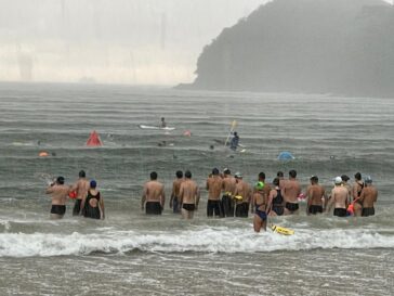 Travessia em mar aberto reúne mais de 100 nadadores e transforma manhã chuvosa em cenário de superação em Cabeçudas