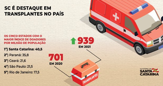 Santa Catarina foi reconhecida pela Associação Brasileira de Transplantes de Órgãos como o estado com maior número de doações efetivas de órgãos para transplantes em 2021. É a 13ª vez nos últimos 17 anos que o estado é destaque nacional na área. Nos outros quatro anos, ficou em segundo, atrás apenas de uma unidade federativa. O Registro Brasileiro de Transplantes confirmou o primeiro lugar para SC com 40,5 doadores por milhão de população (pmp), seguido por Paraná com 35,8 doadores pmp e Ceará e São Paulo – com cerca de 21 doadores pmp cada.