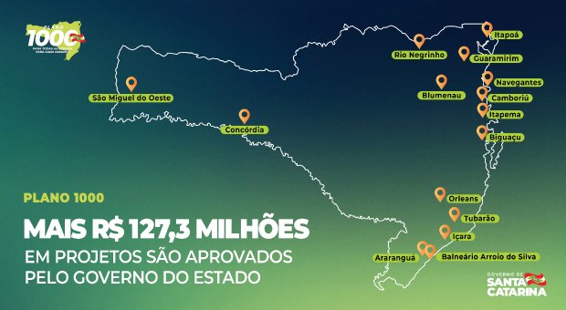 Em uma nova fase do Plano 1000, 15 cidades de Santa Catarina tiveram suas propostas aprovadas para o maior projeto municipalista da história do Estado. A maior parte dos investimentos está relacionada à pavimentação asfáltica, recuperação de pavimentos, acessos e revitalização. Juntas, Araranguá, Balneário Arroio do Silva, Biguaçu, Blumenau, Camboriú, Concórdia, Guaramirim, Içara, Itapema, Itapoá, Navegantes, Orleans, Rio Negrinho, São Miguel do Oeste e Tubarão receberão cerca de R$ 127,3 milhões para tirar obras estruturantes do papel.