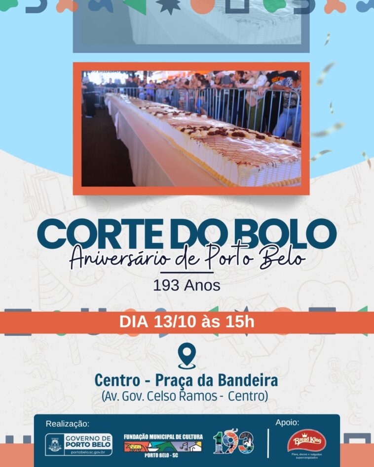 O Governo de Porto Belo, por meio da Fundação Municipal da Cultura, convida a comunidade para participar do tradicional Corte do Bolo em comemoração ao aniversário da cidade, que este ano celebra 193 anos de história.