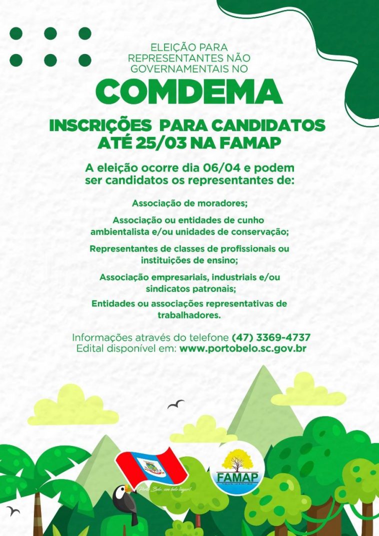 A Fundação do Meio Ambiente do Município de Porto Belo realiza no dia 06 de abril o Fórum para eleição de membros não governamentais do Conselho Municipal de Defesa do Meio Ambiente – Comdema. O conselho é um órgão paritário de caráter consultivo, de assessoramento ao Poder Executivo Municipal e deliberativo no âmbito de sua competência, tendo como finalidade de assessorar, estudar e propor ao Poder Executivo, diretrizes de políticas governamentais para o meio ambiente e os recursos naturais.