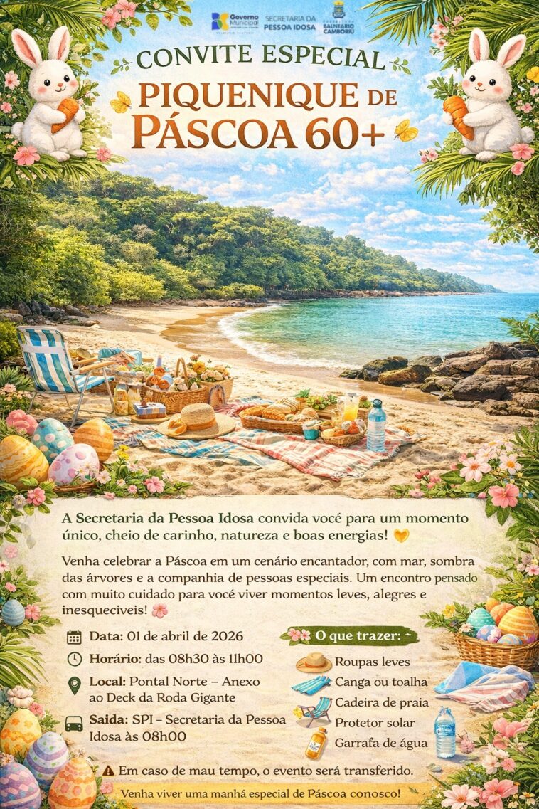 A fim de inserir a pessoa idosa nas celebrações de Páscoa, a Prefeitura de Balneário Camboriú, por meio da Secretaria da Pessoa Idosa (SPI), realiza nesta quarta-feira (1°) um piquenique alusivo à data, das 8h30 às 11h, nas proximidades do Deck do Pontal Norte, na Praia Central.
