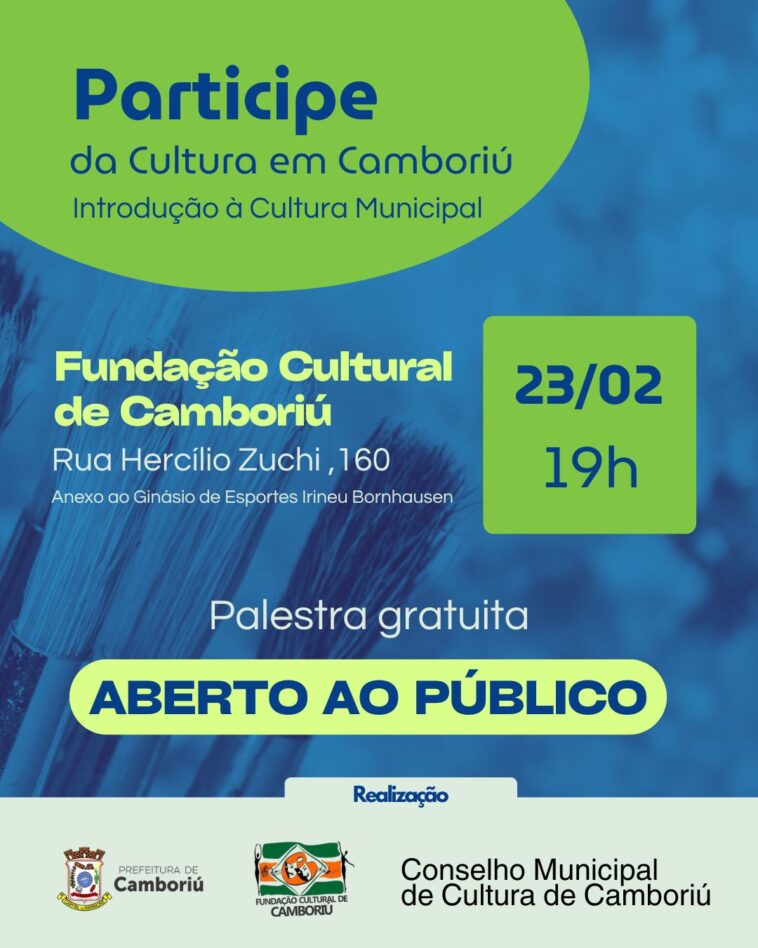 A Prefeitura de Camboriú, por meio da Fundação Cultural e do Conselho Municipal de Cultura, promove no dia 23, às 19h, a palestra “Introdução à Cultura Municipal”. O encontro será realizado na Fundação Cultural de Camboriú, localizada na Rua Hercílio Zuchi, nº 160, anexo ao Ginásio de Esportes Irineu Bornhausen, sendo gratuito e aberto ao público.
