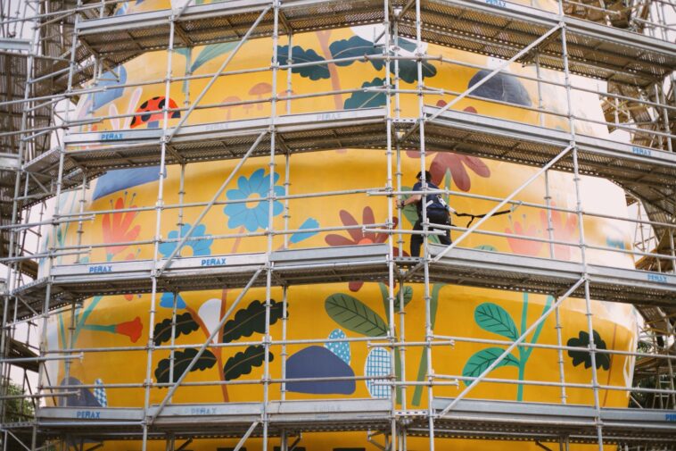 Com a pintura do Maior Ovo Decorado do Mundo concluída, andaimes especiais começam a ser desmontados