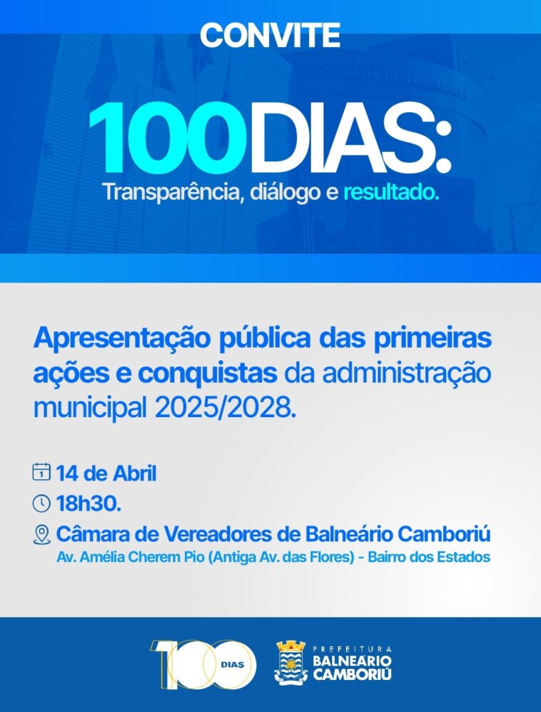 A Prefeitura de Balneário Camboriú promove, na próxima segunda-feira (14), às 18h30, a prestação de contas das ações realizadas nos 100 primeiros dias de governo. O encontro será na Câmara de Vereadores, com apresentação dos principais eixos da administração municipal. A reunião será aberta ao público em geral, autoridades, entidades e imprensa.