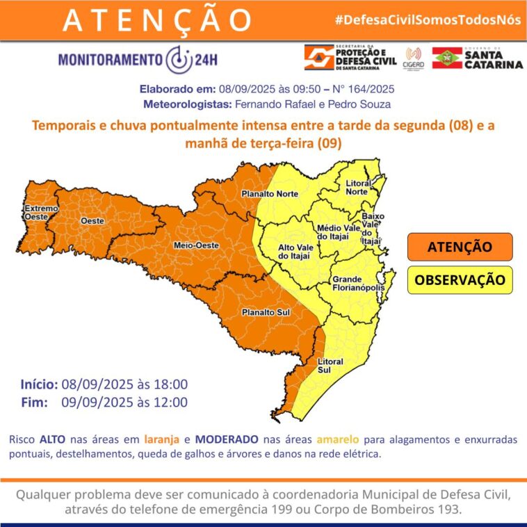 O alerta é válido até às 12h de terça-feira (9) e o risco é moderado para ocorrências associadas a alagamentos e enxurradas pontuais, destelhamentos, danos na rede elétrica e queda de galhos de árvores.