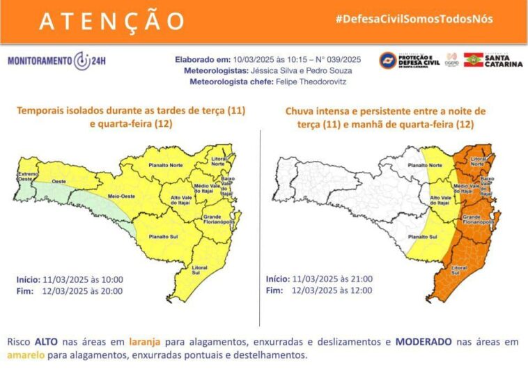 A previsão indica condições para temporais isolados em todas as regiões catarinenses, que podem vir acompanhados por raios, rajadas de vento e, eventualmente, queda de granizo durante as tardes desta terça (11) e quarta-feira (12).