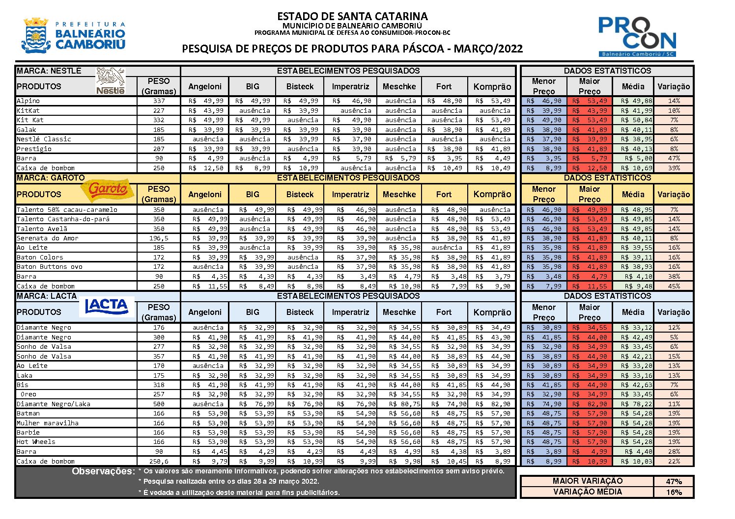 Assim como nos anos anteriores, o Procon encontra variação de preços entre um estabelecimento e outro para o mesmo produto, evidenciando a necessidade e importância da pesquisa de preços pelo consumidor. Neste ano, a maior variação foi de 47%, já a variação média foi de 16%. Além disso, é importante que o consumidor fique atento à gramatura dos produtos, que costumeiramente também motiva alteração do preço final do item.