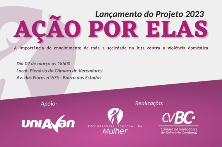 A Procuradoria Especial da Mulher da Câmara de Vereadores de Balneário Camboriú lançará o projeto “Ação por Elas” 2023, no dia 02 de março, no plenário vereador Walter Eilers, às 18h.