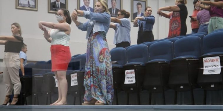 Uma atividade que englobou ginástica laboral e técnicas de osteopatia aconteceu na tarde desta quarta-feira (09), no plenário da Câmara de Balneário Camboriú, voltada às colaboradoras do Legislativo. A organização foi do Programa de Atenção ao Servidor da Casa, e a condução, dos fisioterapeutas e graduandos em Osteopatia Mayara Lais Maier e João Vitor Francisco.