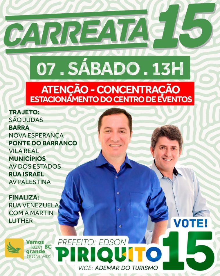 A coligação de Edson Piriquito (MDB) e Ademar Schneider (PSB) tem carreata programada para o período da tarde, com inicio às 13hs. Está marcada a concentração no Centro de Eventos, saindo em direção ao bairro São Judas Tadeu, Barra, Nova Esperança, Ponte do Barranco, Vila Real, Bairro dos Municípios, Avenida do Estado Dalmo Vieira, Rua Israel, Avenida Palestina e finaliza na rua Venezuela com avenida Martin Luther.