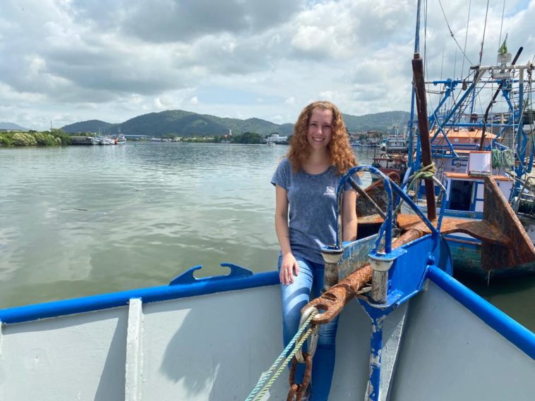 Na foto oceanógrafa do SINDIPI Luana Specht durante visita técnica em embarcação de pesca em Navegantes.