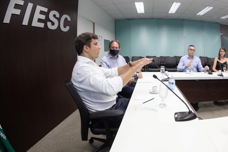 Nesta terça-feira (16) o Prefeito de Balneário Camboriu, Fabrício Oliveira, acompanhado dos secretários Eduardo Krewinkel (administração) e Maria Pissaia (BC Investimentos) participou de reunião de trabalho na Federação das Indústrias do Estado de Santa Catarina – Fiesc, com o Presidente da Instituição, Mário Cezar de Aguiar, e membros da equipe técnica da Federação.