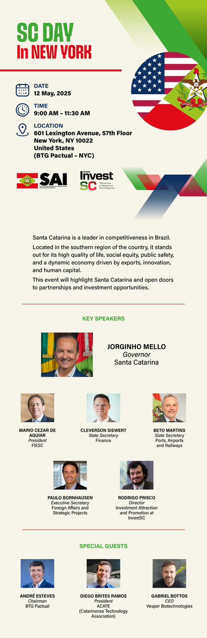 No momento que o mundo se rediscute e toma novos e desafiadores caminhos, o Gov Jorginho Mello, compreendendo o tamanho do desafio, leva Santa Catarina ao centro dessas discussões e no Brasilian Week em Nova York realizará o primeiro “Santa Catarina Day”.
