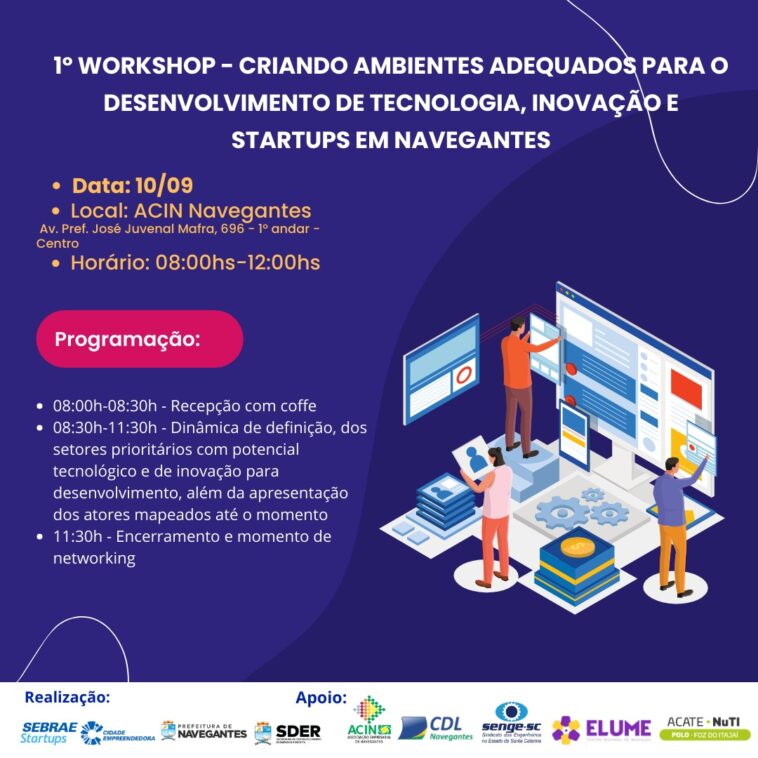 Com o tema “Criando ambientes adequados para o desenvolvimento de tecnologia, inovação e startups”, o workshop integra as ações do Programa Cidade Empreendedora, por meio do Eixo de Inovação. O evento acontece a partir das 8h, no Auditório da ACIN (Avenida Pref. José Juvenal Mafra, 696 – Centro). As inscrições estão abertas e podem ser feitas pelo link: https://bit.ly/encontroinovacaonavegantes.