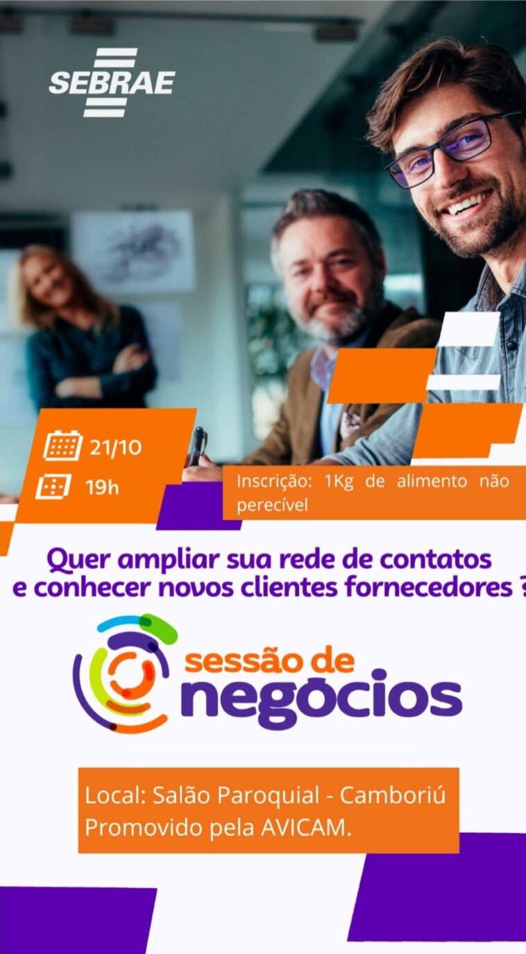 No próximo dia 21 de outubro (terça-feira), micro e pequenos empresários de Camboriú e região terão mais uma oportunidade para fortalecer o seu negócio. O Sebrae/SC, por meio da Regional Foz, realiza uma Sessão de Negócios em parceria com a Associação Visite Camboriú – AVICAM. O evento gratuito acontece no Salão Paroquial, a partir das 19 horas, e conta com 49 vagas disponíveis. As inscrições podem ser feitas pelo link https://forms.office.com/r/eDv09Ht9Uw. A participação é gratuita, mas os organizadores sugerem a doação de 1 kg de alimento não perecível, que será destinado a instituições beneficentes do município.