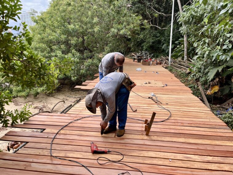 A reforma do deck do Pontal Norte segue em ritmo acelerado. O trecho central, o mais comprometido e o primeiro a ser reconstruído, já recebeu uma nova base estrutural. Atualmente, as equipes trabalham na instalação das novas tábuas de madeira que vão compor o assoalho.